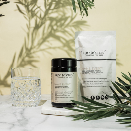Formulated by naturopaths and trichologists, Mane Event® promotes hair growth, condition and thickness from within using vegan ingredients of the finest quality. Featuring Apotecari’s exclusive Hairtellectual® hyaluronic acid for soft, touchable and plump strands along with herbs, amino acids, vitamins, minerals and antioxidants. This advanced, professional-grade formulation delivers targeted nutrition for intensified growth and reduced hair fall.