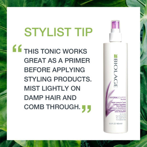 Quench your thirst for beautiful hair. Inspired by the ever-hydrated aloe plant, Biolage HydraSource Daily Leave-In Tonic for dry hair helps optimize moisture balance for healthy looking hair, renews shine and helps protect hair from environmental aggressors.