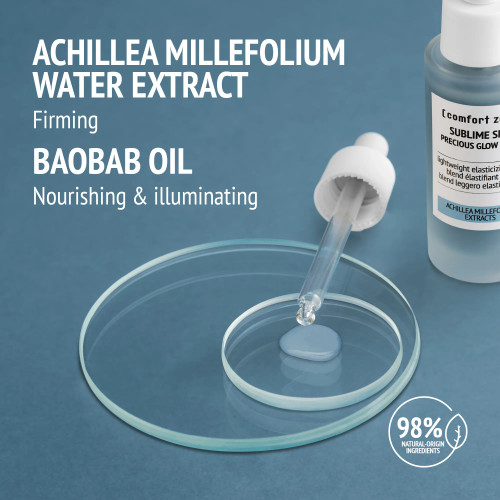 Comfort Zone Sublime Skin Precious Glow Drops 30ml is a face serum for instantly more radiant skin. Its precious dual-phase blend combines the aqueous extract and oleolite of Achillea millefolium, capturing the extraordinary richness of the plant's functional compounds in every drop. Enriched with Baobab oil, it helps support skin barrier function and architecture, rocking skin elasticity. With its biomimetic texture, this formulation creates an harmonious affinity with your skin, nourishing it without weighing it down and leaving it smoother and firmer every day!