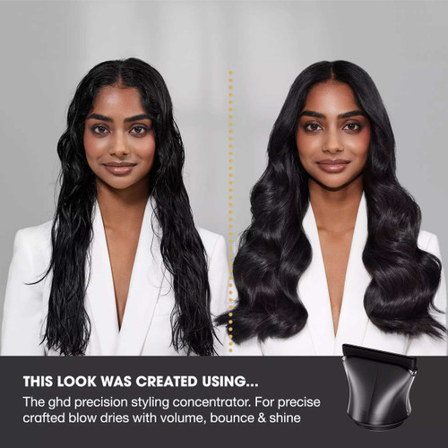 Unlock your most creative styles with the ghd professional styling concentrator. Featuring a narrow 66mm professional outlet, this hair dryer nozzle delivers a high-pressure mixed-airflow for a hotter airstream that enhances shape, boosts shine by 64%¹, and lifts roots by 3x⁴, ideal for precision styling with professional results. Fully compatible with the ghd speed ionic hair dryer, the precision styling concentrator hair dryer attachment is your new go-to for the perfect blow dry.