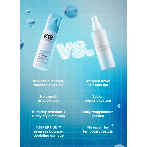 K18 AstroLift Volume Spray is a lightweight, buildable volume spray, powered by K18PEPTIDE™ to reverse bounce-depleting damage that can impact all hair types – especially fine, fragile, aging and breakage-prone hair. The K18 AstroLift Volume Spray hair fiber thickening, non-sticky blend helps hair look and feel fuller, delivering flexible volume for up to 2 days* – with or without heat styling on dry or towel-dried hair.