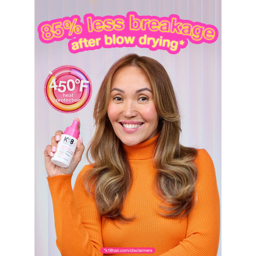 K18 Heat Bounce Conditioning Heat Protectant 118ml is the future of heat protection. This leave-in conditioning heat protectant detangles, softens, and shields hair with advanced heat protection — reducing breakage by up to 85% after blow-drying.⁷