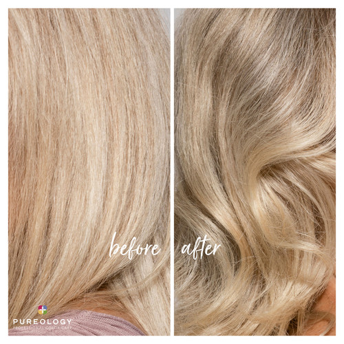 Step 2: Apply a 5-cent-sized amount of the Pureology Pure Volume Conditioner to freshly shampooed hair, focusing on the midlengths and ends. Gently massage through hair. Wait 1-2 inutes. Rinse.