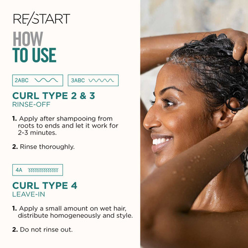 Restart Curls Nourishing Conditioner is a dual action melting conditioner for wavy, curly and coily hair helps to balance the scalp’s microbiome,* nourishes and moisturizes curly hair, providing long-lasting definition** and retaining the hair’s natural moisture by keeping its protective cuticle layer on lockdown. Formulated with jojoba oil and vegan biomimetic lipids that restore hair’s natural oils, the silicone-free conditioner provides frizz control and maintains elasticity for ultimate curl definition and bounce.